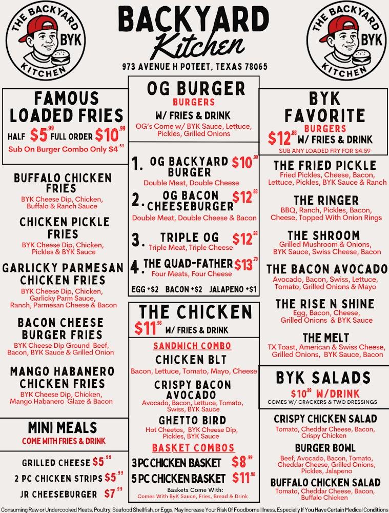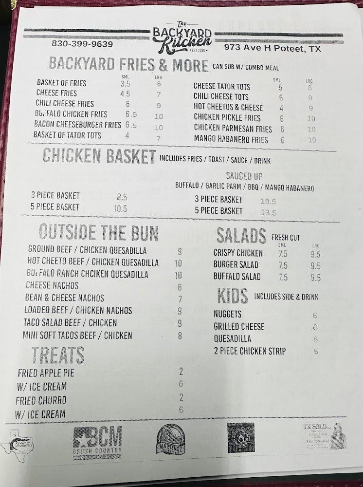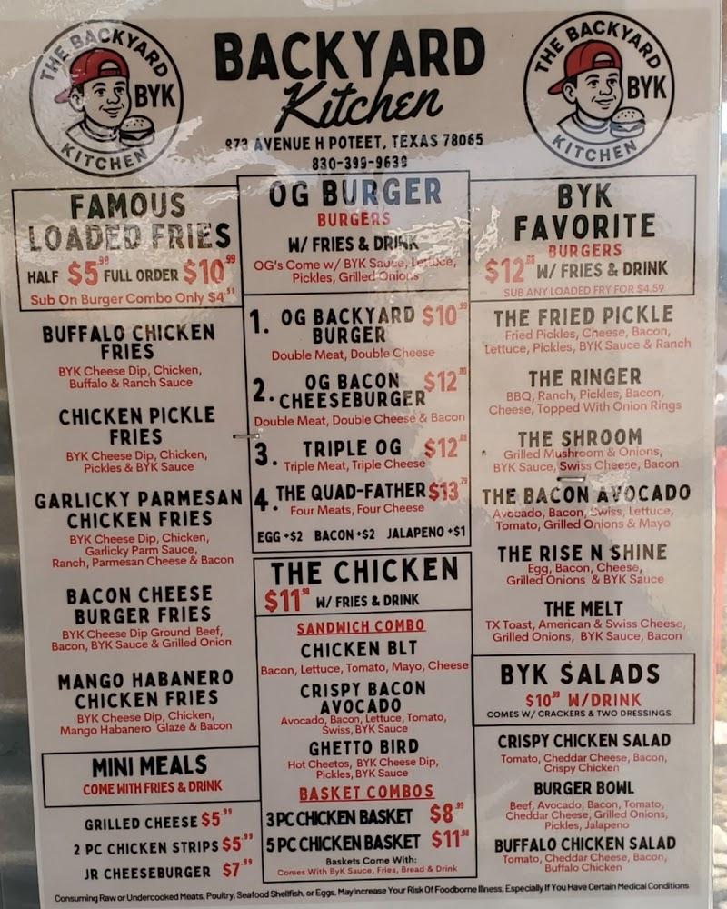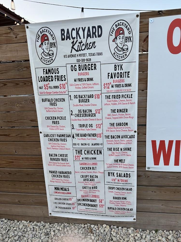 Welcome to The Backyard Kitchen, your new favorite burger joint located at 973 Avenue H, Poteet, TX! Enjoy delicious, traditional cuisine in our inviting indoor dining room or relax on the outdoor patio. Our BYOB policy allows you to personalize your dining experience, while our drive-thru service offers convenience for on-the-go meals. We cater to families with a kids’ menu and amenities such as high chairs and changing tables. Enjoy live music and sports, and take advantage of our happy hour specials. With accessible facilities and free parking, The Backyard Kitchen is perfect for everyone. Visit us today!